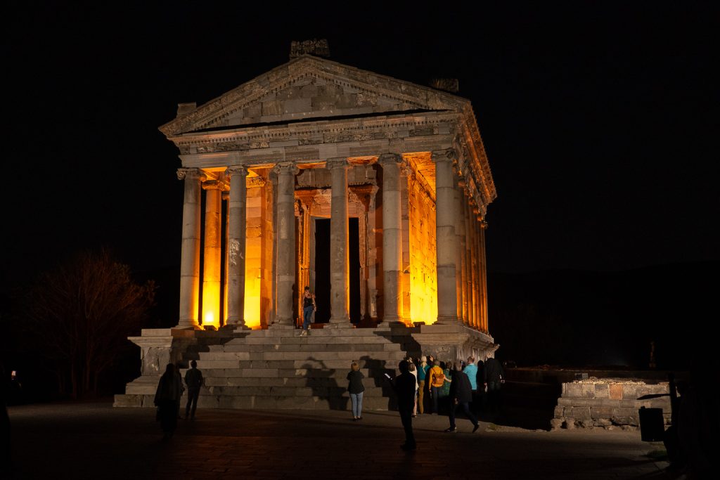 Über der Schlucht thront der Tempel von Garni aus dem 1. Jahrhundert n. Chr. als Zeugnis der reichen Geschichte der Region, zu dem wir mit unserem Bus gefahren wurden. Bei Vollmond gingen zu dem antiken griechisch- römischen Tempel, der mit verschiedenfarbigen Licht angestrahlt wurde.