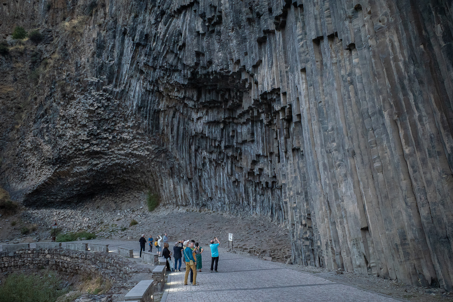 Anschließend haben wir die „Sinfonie der Steine“, auch bekannt als „Basaltorgel“ besucht. Das Naturwunder liegt 23 km östlich von Jerewan, nahe dem Dorf Garni. Die riesigen Basaltsäulen sind fast 50 m hoch. Ihre bemerkenswerte Symmetrie und schwerelose Anordnung lassen sie fast wie von Menschenhand geschaffen erscheine, ähnlich den Pfeifen einer Orgel. Da die Dämmerung bereits eingesetzt hatte beschlossen wir mit einer kleinen Bahn durch das Tal zum Ausgang zu fahren.
